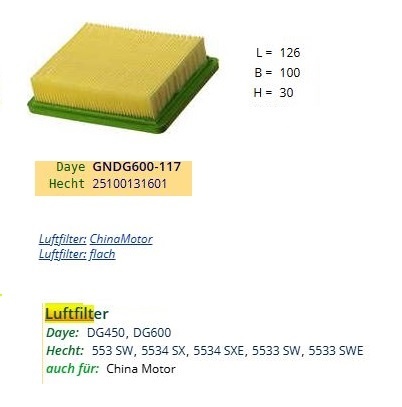 Passend L =126 B =100 H =30 für Daye GNDG600-117 - Hecht 25100131601 - China Motor - 1 Stück Luftfilter flach Modelle Daye DG450, DG600 Hecht 553 SW, 5534 SX, 5534 SXE, 5533 SW, 5533 SWE